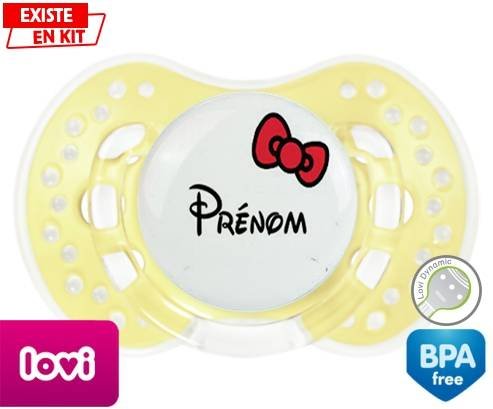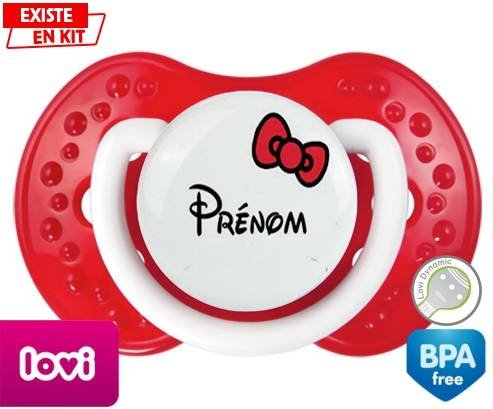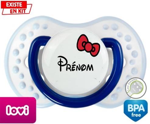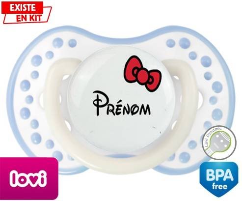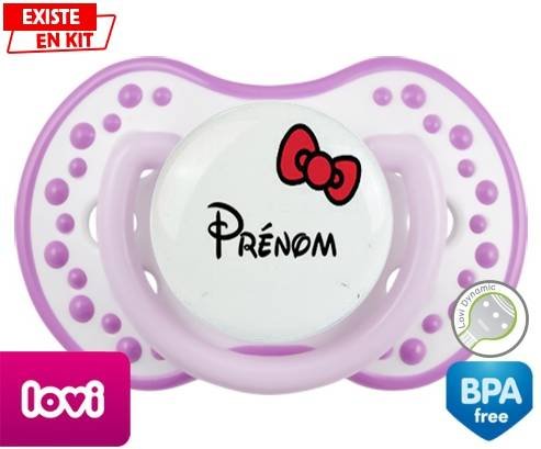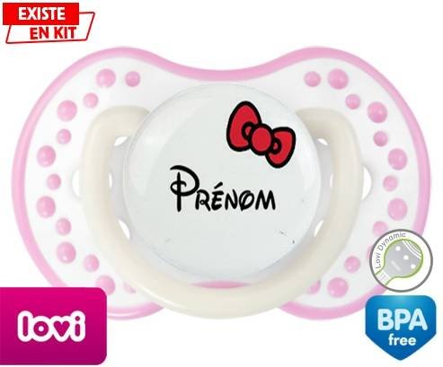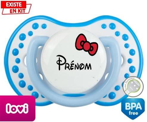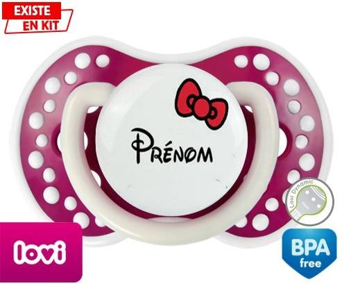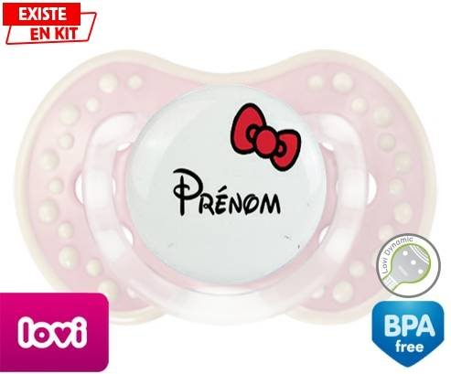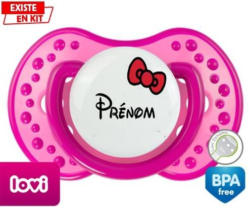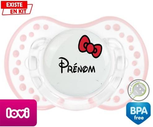 Sucette personnalisée pour bébé Noeud + prénom à embout LOVI Dynamic en silicone de la marque Lovi Dynamic avec impression en en Couleurs de la collection Prénom personnalisé.La silicone se reconnaît par sa couleur transparente. C'est une matière souple, douce, sans goût ni odeur et offre à bébé une succion plus facile grâce à sa souplesse.