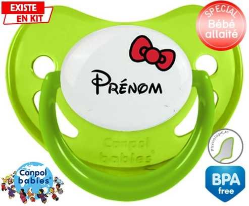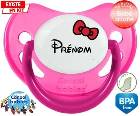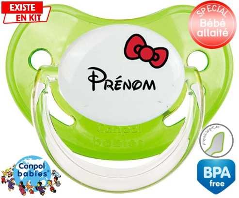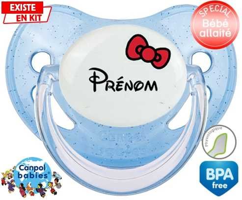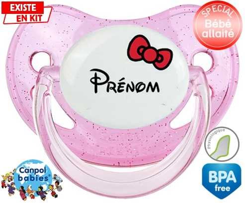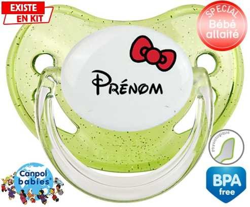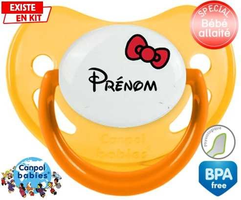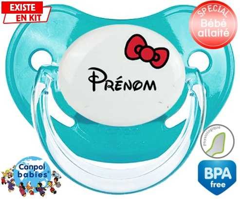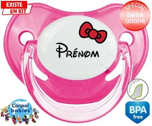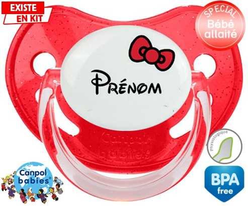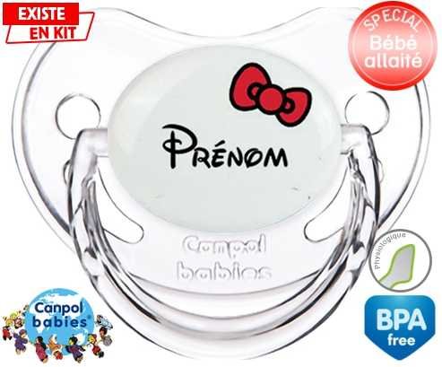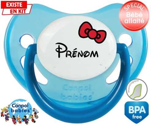 Tétine personnalisée pour bébé Noeud + prénom à embout Physiologique en silicone de la marque Canpol Babies avec impression en en Couleurs de la collection Prénom personnalisé.La silicone se reconnaît par sa couleur transparente. C'est une matière souple, douce, sans goût ni odeur et offre à bébé une succion plus facile grâce à sa souplesse.