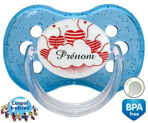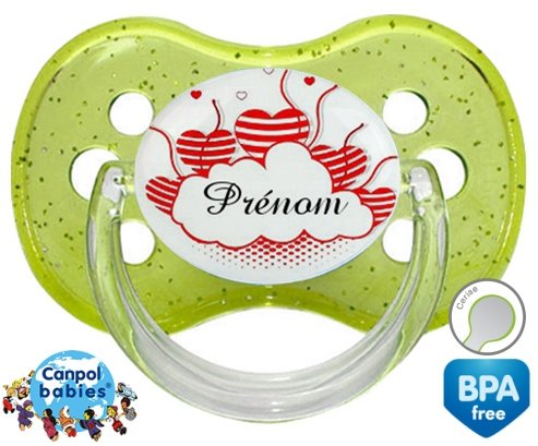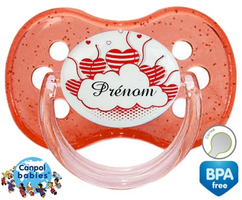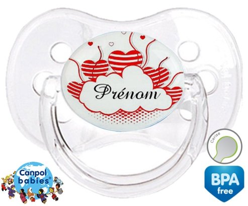 Sucette personnalisée pour bébé Nuage cœur + prénom à embout Cerise en silicone de la marque Canpol Babies avec impression en en Couleurs de la collection Prénom personnalisé.La silicone se reconnaît par sa couleur transparente. C'est une matière souple, douce, sans goût ni odeur et offre à bébé une succion plus facile grâce à sa souplesse.