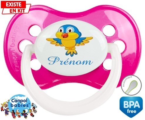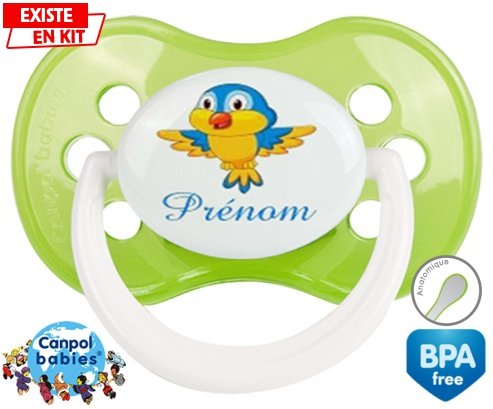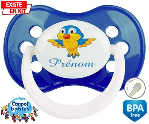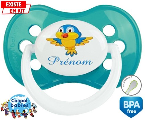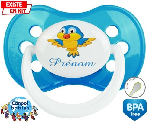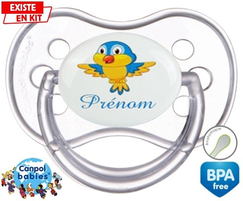 Sucette personnalisée pour bébé Oiseau bleu style1 + prénom à embout Anatomique en silicone de la marque Canpol Babies avec impression en en Couleurs de la collection Prénom personnalisé.La silicone se reconnaît par sa couleur transparente. C'est une matière souple, douce, sans goût ni odeur et offre à bébé une succion plus facile grâce à sa souplesse.