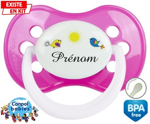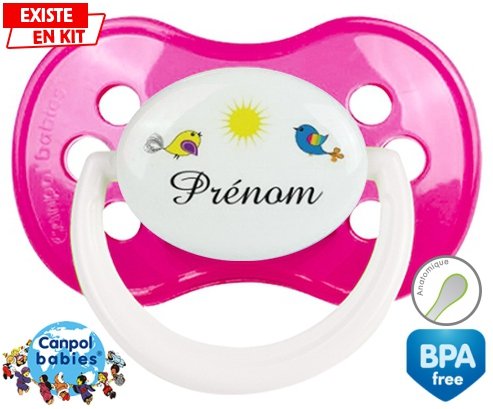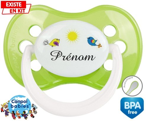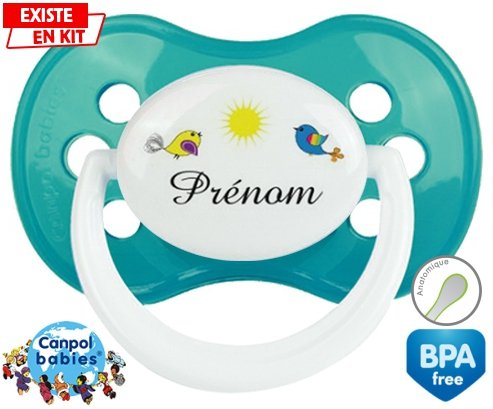 Sucette personnalisée pour bébé Oiseau et soleil + prénom à embout Anatomique en silicone de la marque Canpol Babies avec impression en en Couleurs de la collection Prénom personnalisé.La silicone se reconnaît par sa couleur transparente. C'est une matière souple, douce, sans goût ni odeur et offre à bébé une succion plus facile grâce à sa souplesse.
