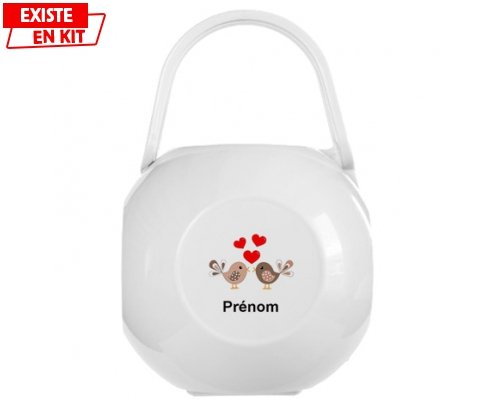 Boîte à sucette personnalisée : Oiseaux cœur + prénom , avec une impression en couleur et qui compléte toute la gamme ( sucette, attache-sucette, bavoir, chausson, body et bonnet).