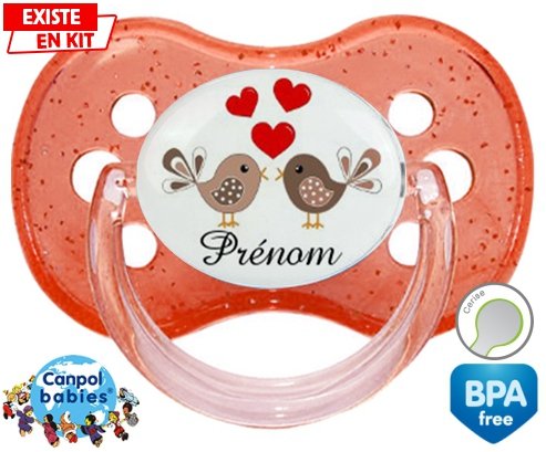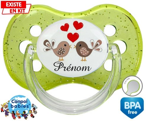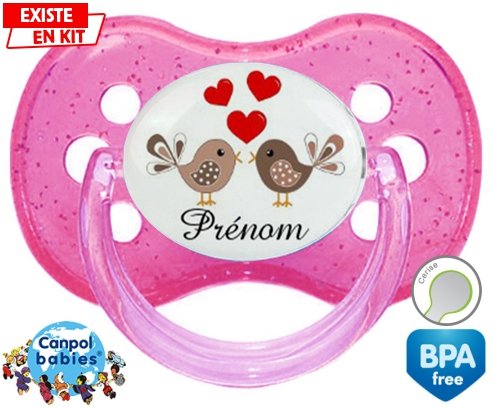 Sucette personnalisée pour bébé Oiseaux cœur + prénom à embout Cerise en silicone de la marque Canpol Babies avec impression en en Couleurs de la collection Prénom personnalisé.La silicone se reconnaît par sa couleur transparente. C'est une matière souple, douce, sans goût ni odeur et offre à bébé une succion plus facile grâce à sa souplesse.