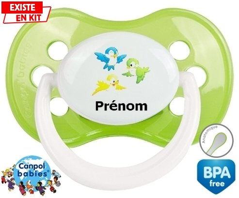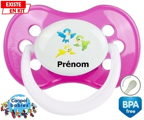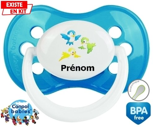 Tétine personnalisée pour bébé Oiseaux style1 + prénom à embout Anatomique en silicone de la marque Canpol Babies avec impression en en Couleurs de la collection Prénom personnalisé.La silicone se reconnaît par sa couleur transparente. C'est une matière souple, douce, sans goût ni odeur et offre à bébé une succion plus facile grâce à sa souplesse.