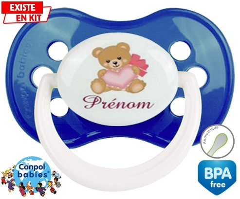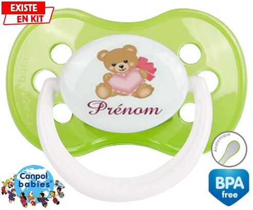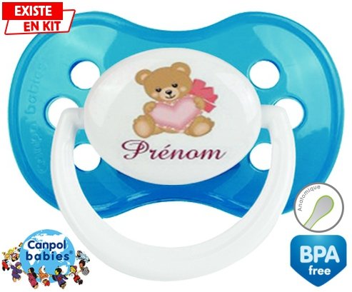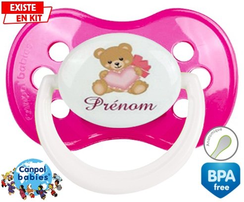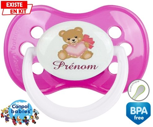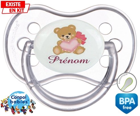 Sucette personnalisée pour bébé Ours cœur + prénom à embout Anatomique en silicone de la marque Canpol Babies avec impression en en Couleurs de la collection Prénom personnalisé.La silicone se reconnaît par sa couleur transparente. C'est une matière souple, douce, sans goût ni odeur et offre à bébé une succion plus facile grâce à sa souplesse.