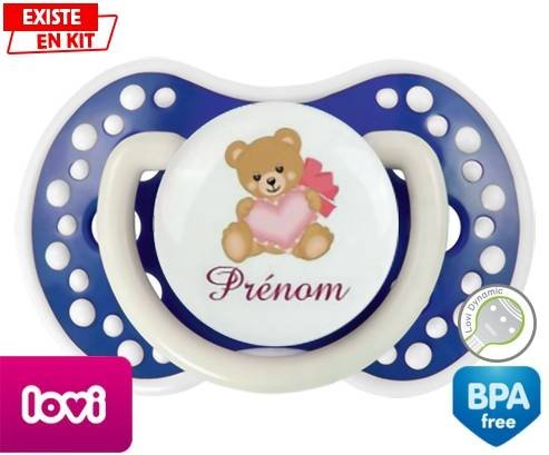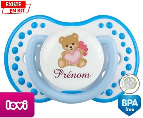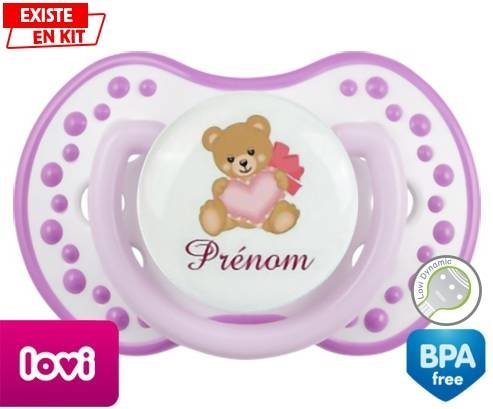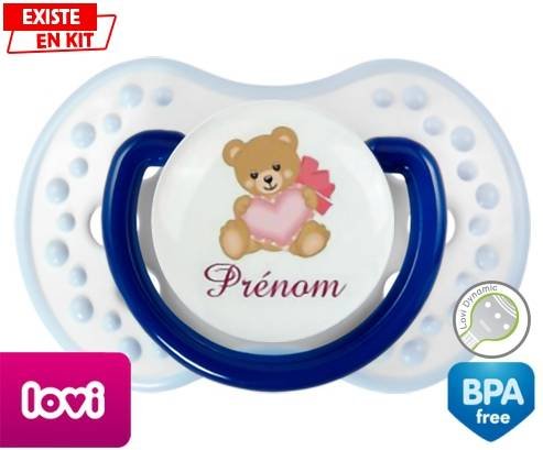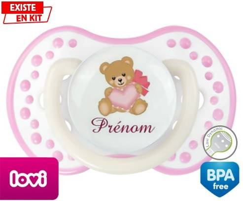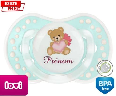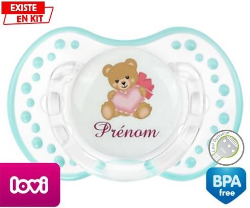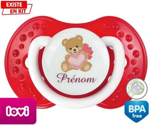 Tétine personnalisée pour bébé Ours cœur + prénom à embout LOVI Dynamic en silicone de la marque Lovi Dynamic avec impression en en Couleurs de la collection Prénom personnalisé.La silicone se reconnaît par sa couleur transparente. C'est une matière souple, douce, sans goût ni odeur et offre à bébé une succion plus facile grâce à sa souplesse.