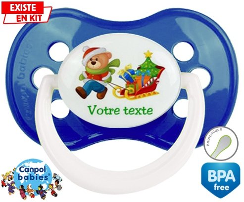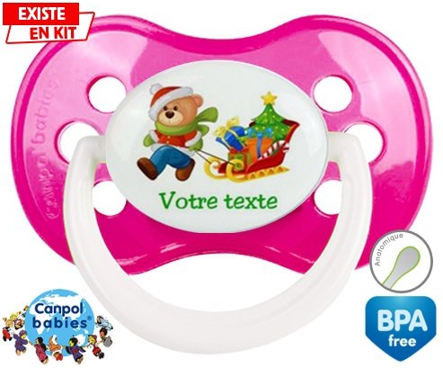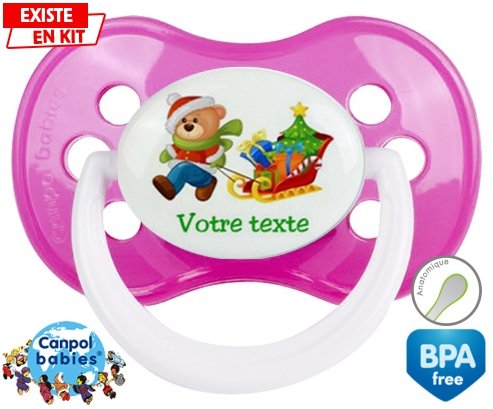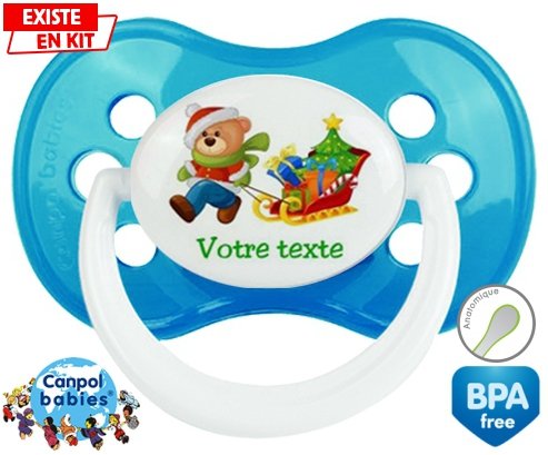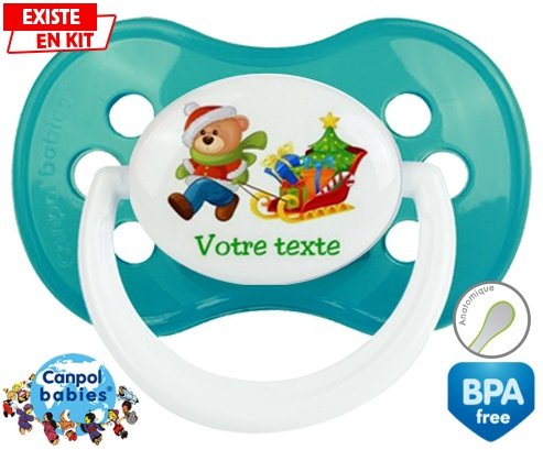 Tetine personnalisee avec le prénom pour bébé Ours noël traineau + prénom : Embout Anatomique en silicone de la marque Canpol Babies avec impression en couleur.
