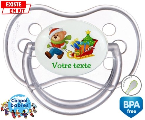 Tetine personnalisee pour bébé Ours noël traineau + prénom à embout Anatomique en silicone de la marque Canpol Babies avec impression en en Couleurs de la collection Prénom personnalisé.La silicone se reconnaît par sa couleur transparente. C'est une matière souple, douce, sans goût ni odeur et offre à bébé une succion plus facile grâce à sa souplesse.