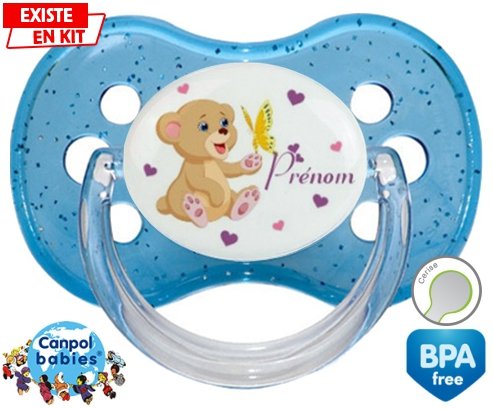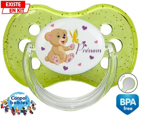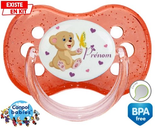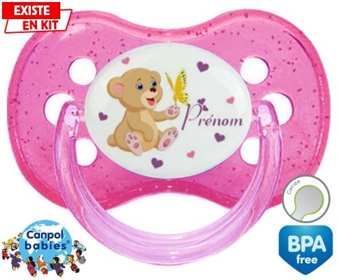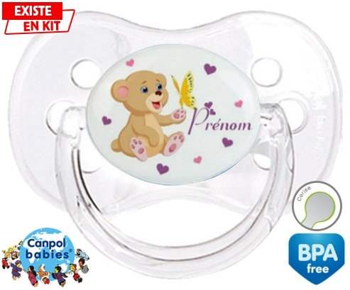 Tetine personnalisee pour bébé Ours papillon + prénom à embout Cerise en silicone de la marque Canpol Babies avec impression en en Couleurs de la collection Prénom personnalisé.La silicone se reconnaît par sa couleur transparente. C'est une matière souple, douce, sans goût ni odeur et offre à bébé une succion plus facile grâce à sa souplesse.