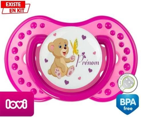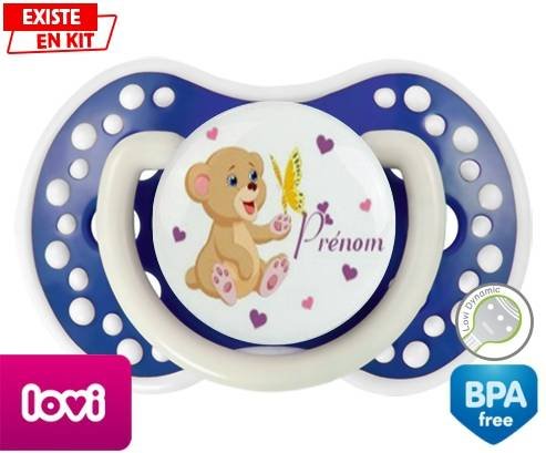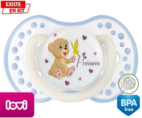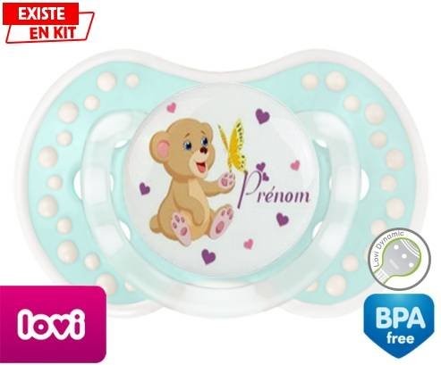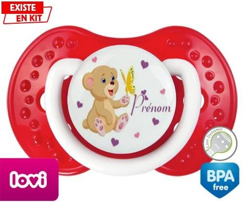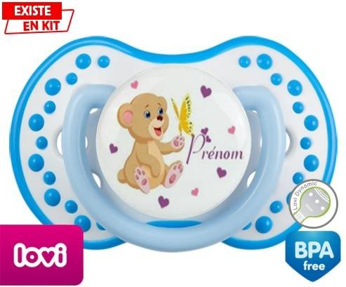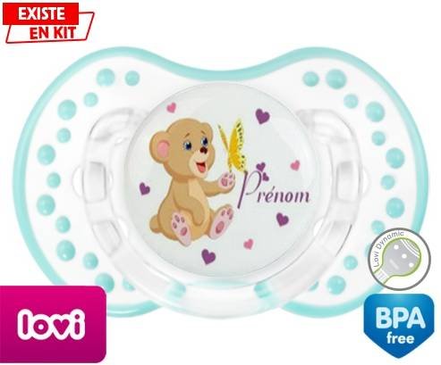 Sucette personnalisée pour bébé Ours papillon + prénom à embout LOVI Dynamic en silicone de la marque Lovi Dynamic avec impression en en Couleurs de la collection Prénom personnalisé.La silicone se reconnaît par sa couleur transparente. C'est une matière souple, douce, sans goût ni odeur et offre à bébé une succion plus facile grâce à sa souplesse.