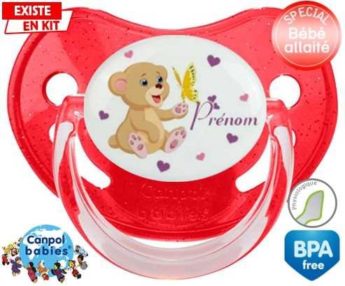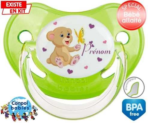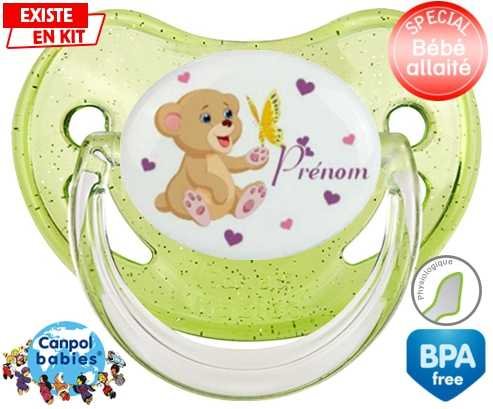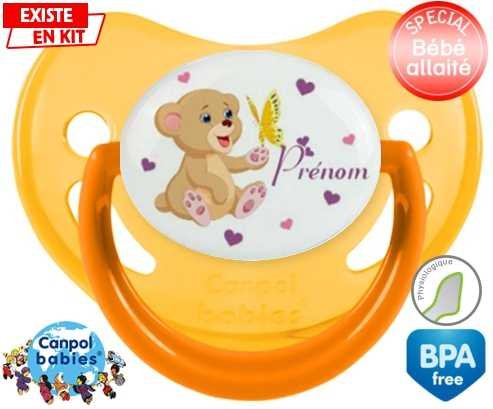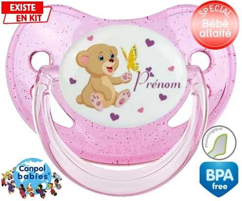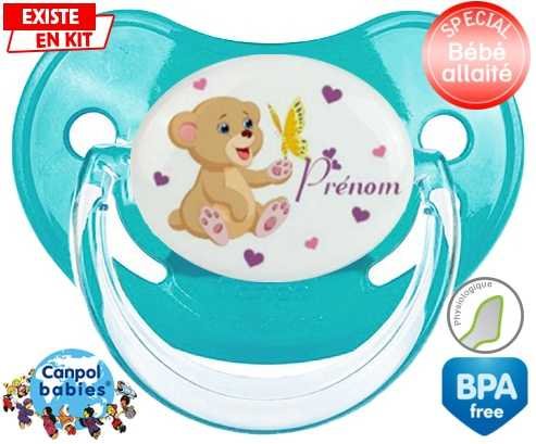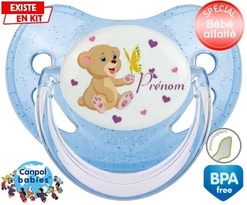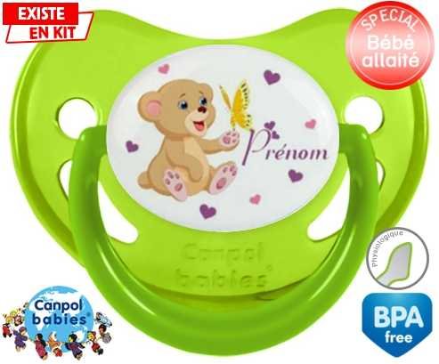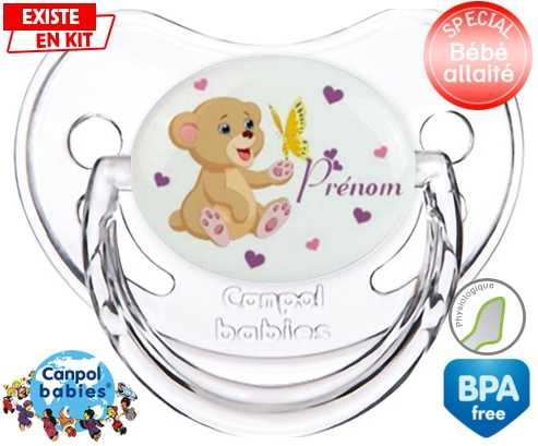 Sucette personnalisée pour bébé Ours papillon + prénom à embout Physiologique en silicone de la marque Canpol Babies avec impression en en Couleurs de la collection Prénom personnalisé.La silicone se reconnaît par sa couleur transparente. C'est une matière souple, douce, sans goût ni odeur et offre à bébé une succion plus facile grâce à sa souplesse.