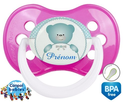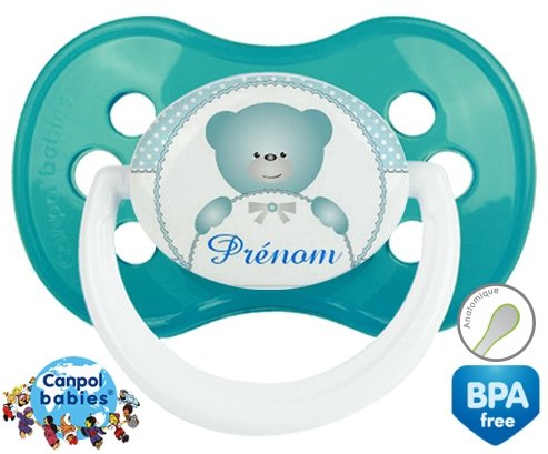 Sucette personnalisée pour bébé Ourson bleu + prénom à embout Anatomique en silicone de la marque Canpol Babies avec impression en en Couleurs de la collection Prénom personnalisé.La silicone se reconnaît par sa couleur transparente. C'est une matière souple, douce, sans goût ni odeur et offre à bébé une succion plus facile grâce à sa souplesse.
