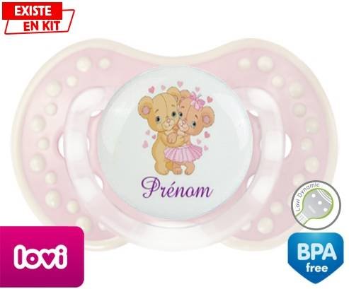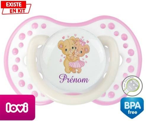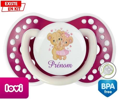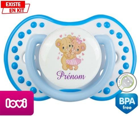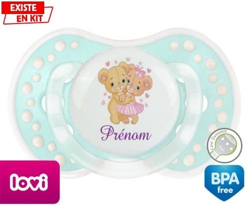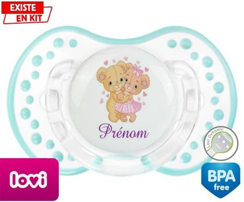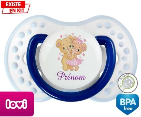 Sucette personnalisée pour bébé Ourson câlin + prénom à embout LOVI Dynamic en silicone de la marque Lovi Dynamic avec impression en en Couleurs de la collection Prénom personnalisé.La silicone se reconnaît par sa couleur transparente. C'est une matière souple, douce, sans goût ni odeur et offre à bébé une succion plus facile grâce à sa souplesse.