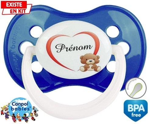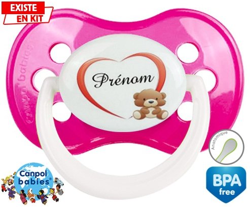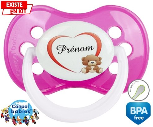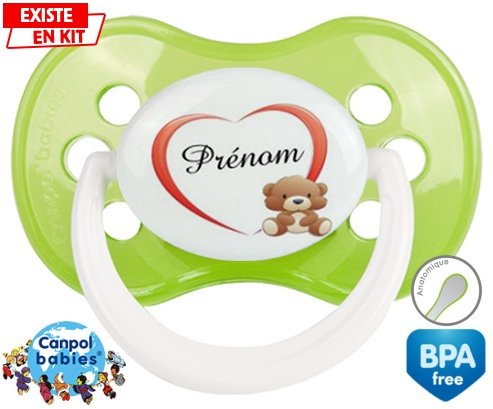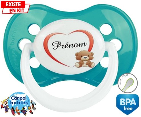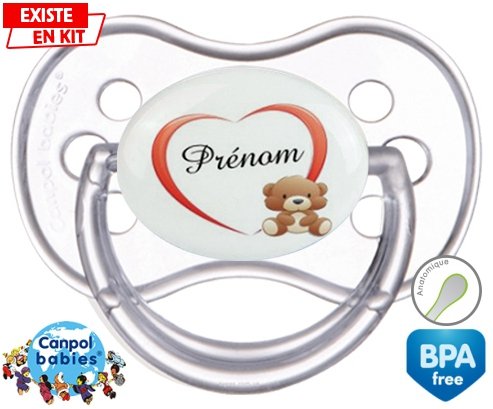 Sucette personnalisée pour bébé Ourson cœur + prénom à embout Anatomique en silicone de la marque Canpol Babies avec impression en en Couleurs de la collection Prénom personnalisé.La silicone se reconnaît par sa couleur transparente. C'est une matière souple, douce, sans goût ni odeur et offre à bébé une succion plus facile grâce à sa souplesse.
