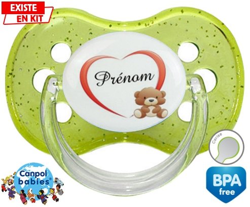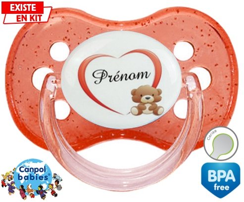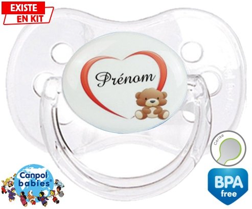 Sucette personnalisée pour bébé Ourson cœur + prénom à embout Cerise en silicone de la marque Canpol Babies avec impression en en Couleurs de la collection Prénom personnalisé.La silicone se reconnaît par sa couleur transparente. C'est une matière souple, douce, sans goût ni odeur et offre à bébé une succion plus facile grâce à sa souplesse.