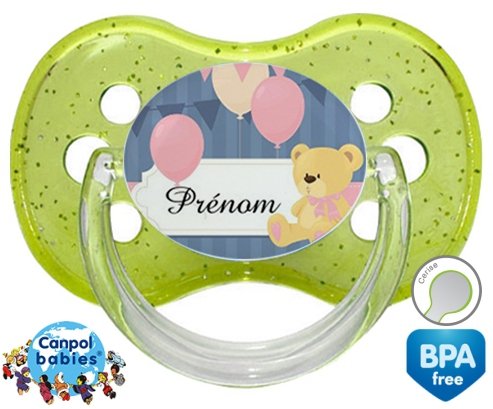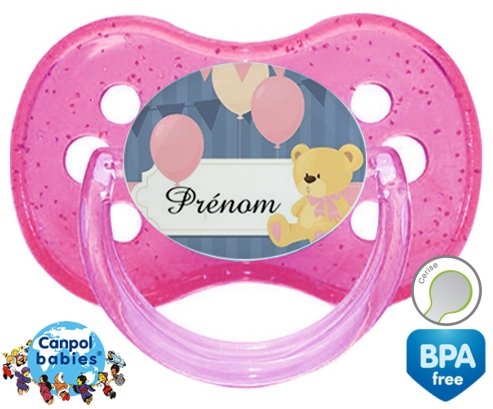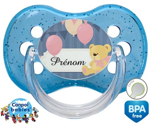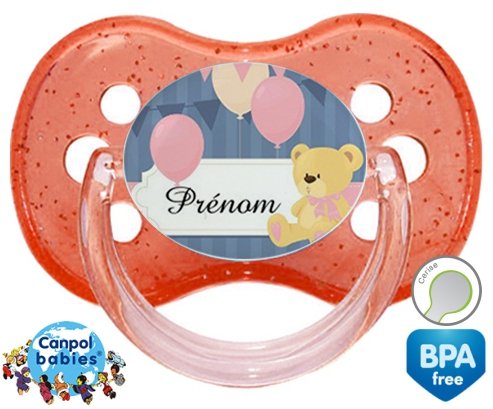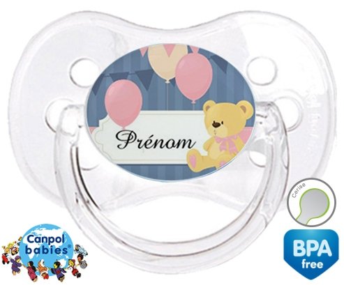 Tetine personnalisee pour bébé Ourson et ballon + prénom à embout Cerise en silicone de la marque Canpol Babies avec impression en en Couleurs de la collection Prénom personnalisé.La silicone se reconnaît par sa couleur transparente. C'est une matière souple, douce, sans goût ni odeur et offre à bébé une succion plus facile grâce à sa souplesse.