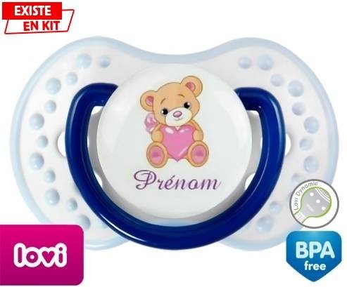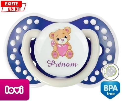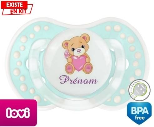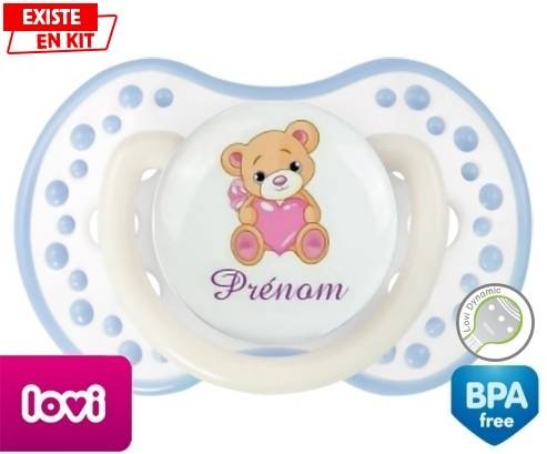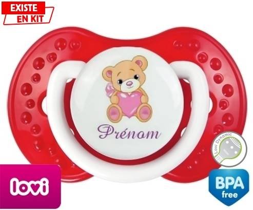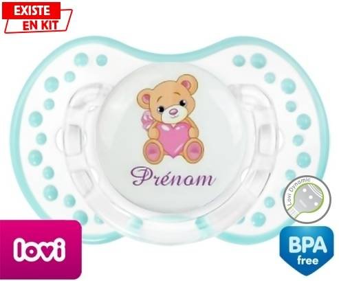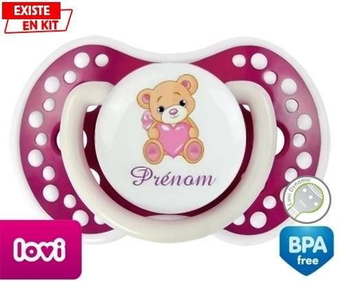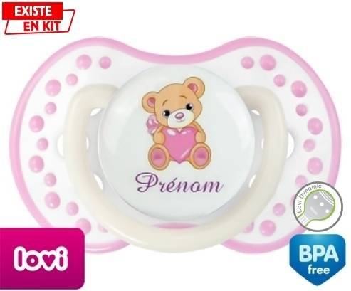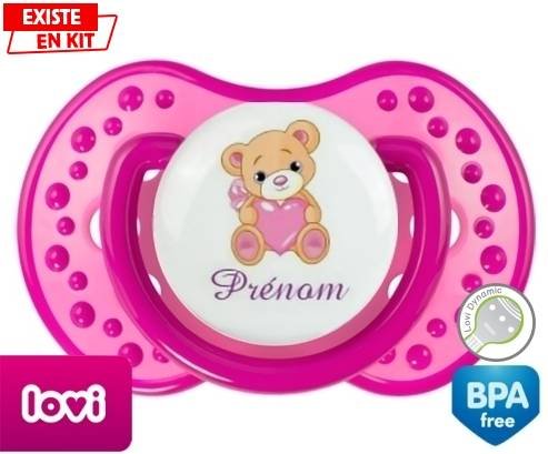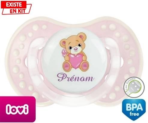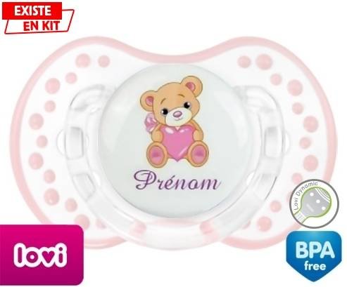 Sucette personnalisée pour bébé Ourson (fille) + prénom à embout LOVI Dynamic en silicone de la marque Lovi Dynamic avec impression en en Couleurs de la collection Prénom personnalisé.La silicone se reconnaît par sa couleur transparente. C'est une matière souple, douce, sans goût ni odeur et offre à bébé une succion plus facile grâce à sa souplesse.