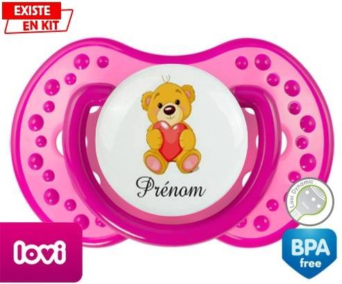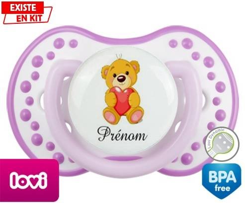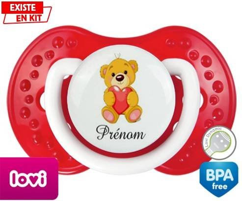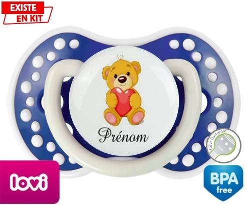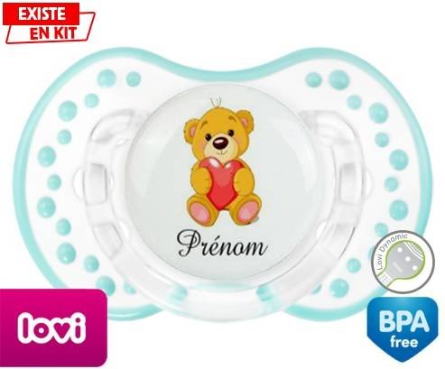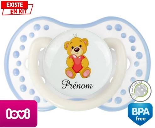 Sucette personnalisée pour bébé Ourson (garçon) + prénom à embout LOVI Dynamic en silicone de la marque Lovi Dynamic avec impression en en Couleurs de la collection Prénom personnalisé.La silicone se reconnaît par sa couleur transparente. C'est une matière souple, douce, sans goût ni odeur et offre à bébé une succion plus facile grâce à sa souplesse.