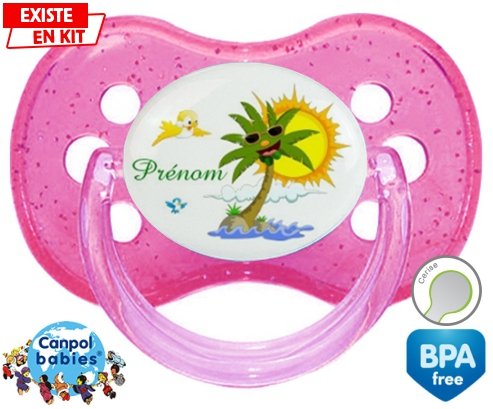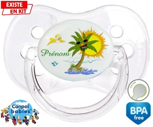 Tetine personnalisee pour bébé Palmier style2 + prénom à embout Cerise en silicone de la marque Canpol Babies avec impression en en Couleurs de la collection Prénom personnalisé.La silicone se reconnaît par sa couleur transparente. C'est une matière souple, douce, sans goût ni odeur et offre à bébé une succion plus facile grâce à sa souplesse.