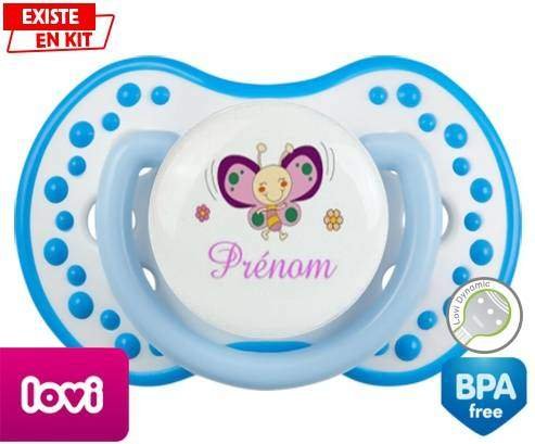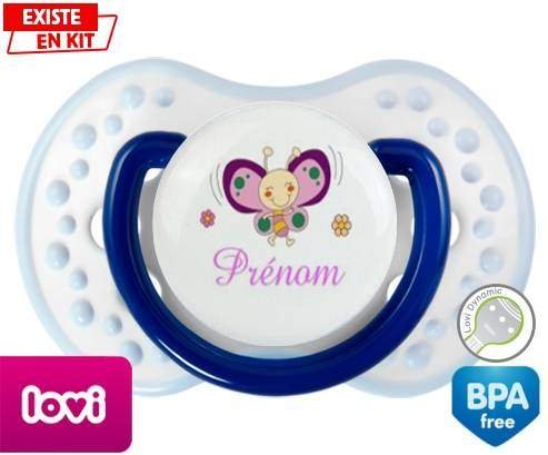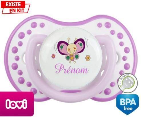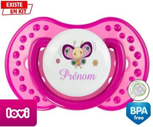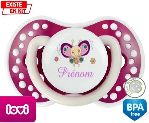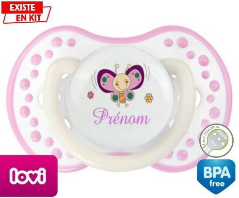 Sucette personnalisée pour bébé Papillon souriant (fille) + prénom à embout LOVI Dynamic en silicone de la marque Lovi Dynamic avec impression en en Couleurs de la collection Prénom personnalisé.La silicone se reconnaît par sa couleur transparente. C'est une matière souple, douce, sans goût ni odeur et offre à bébé une succion plus facile grâce à sa souplesse.