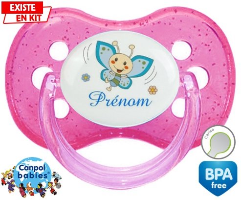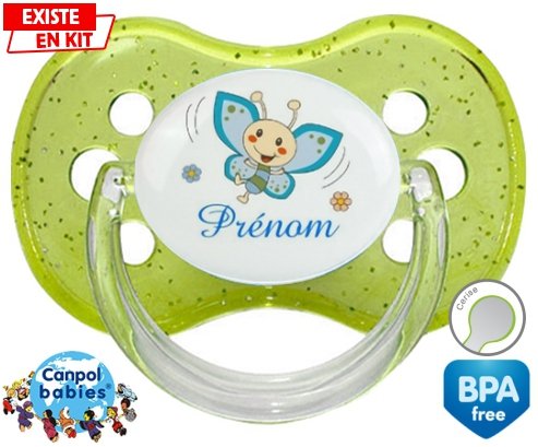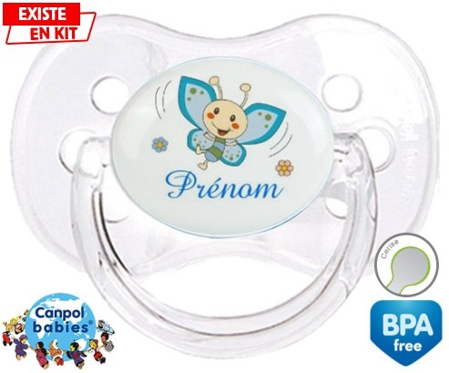 Tétine personnalisée pour bébé Papillon souriant (garçon) + prénom à embout Cerise en silicone de la marque Canpol Babies avec impression en en Couleurs de la collection Prénom personnalisé.La silicone se reconnaît par sa couleur transparente. C'est une matière souple, douce, sans goût ni odeur et offre à bébé une succion plus facile grâce à sa souplesse.