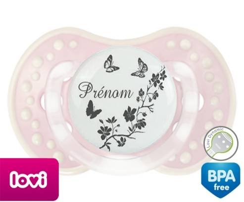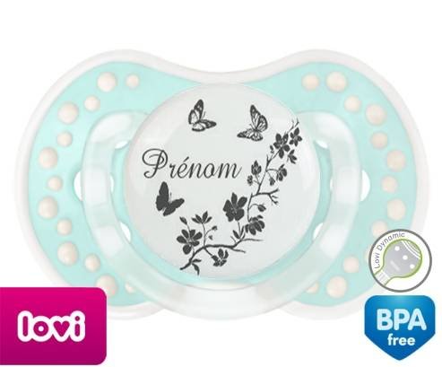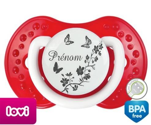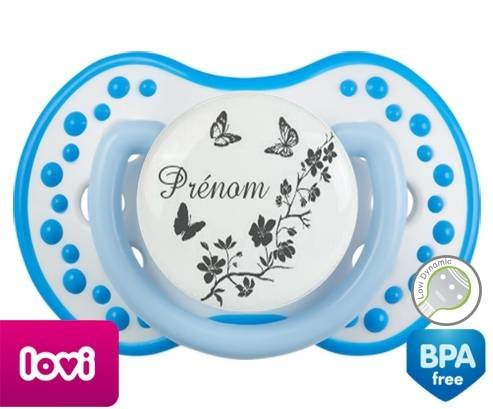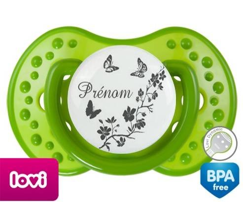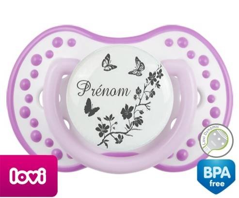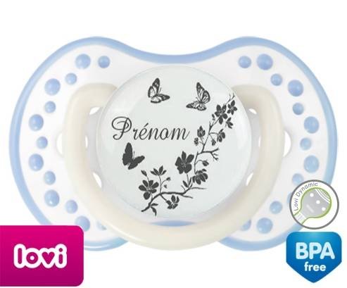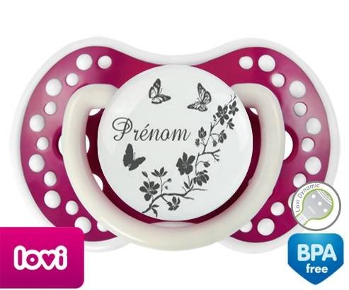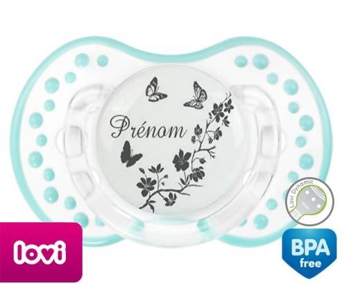 Offrez à votre bébé une tétine personnalisée alliant douceur et originalité. L'embout LOVI Dynamic, inspiré de la forme naturelle du mamelon, assure un confort optimal. Le motif délicat de papillons imprimé avec le prénom de votre enfant apporte une touche unique et tendre. Idéale pour rassurer et accompagner les premiers sourires.