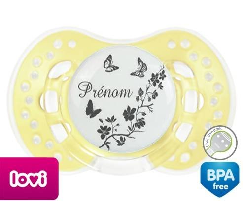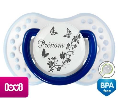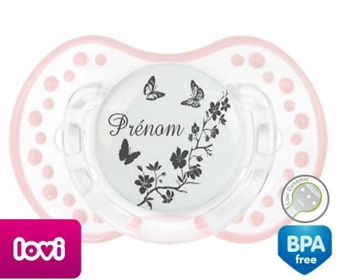 Tétine personnalisée pour bébé Papillons + prénom à embout LOVI Dynamic en silicone de la marque Lovi Dynamic avec impression en en Gris de la collection Prénom personnalisé.La silicone se reconnaît par sa couleur transparente. C'est une matière souple, douce, sans goût ni odeur et offre à bébé une succion plus facile grâce à sa souplesse.