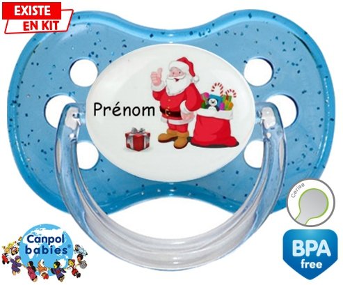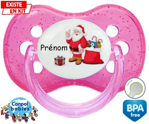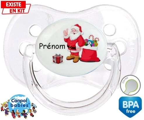 Sucette personnalisée pour bébé Père noël et cadeau + prénom à embout Cerise en silicone de la marque Canpol Babies avec impression en en Couleurs de la collection Prénom personnalisé.La silicone se reconnaît par sa couleur transparente. C'est une matière souple, douce, sans goût ni odeur et offre à bébé une succion plus facile grâce à sa souplesse.