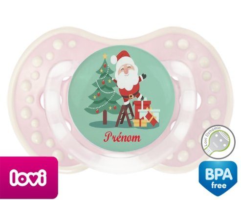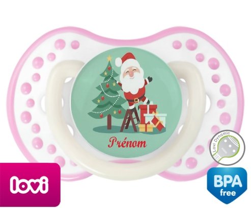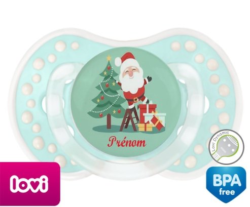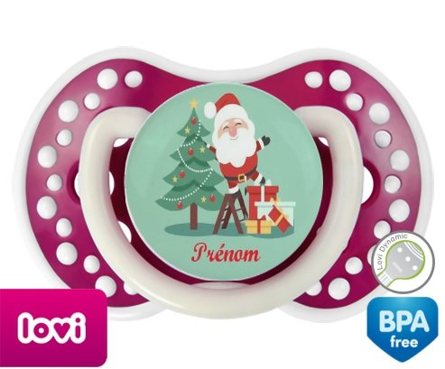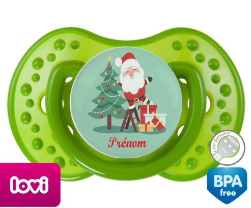 Tétine personnalisée avec le prénom pour bébé Père noël et sapin + prénom : Tétine LOVI Dynamic en silicone de la marque Lovi Dynamic avec impression en couleur.