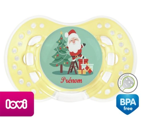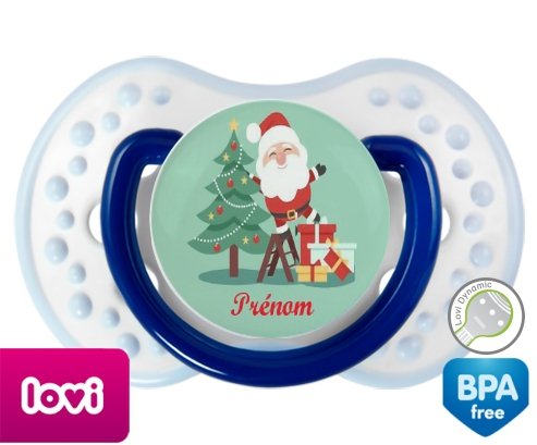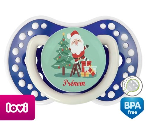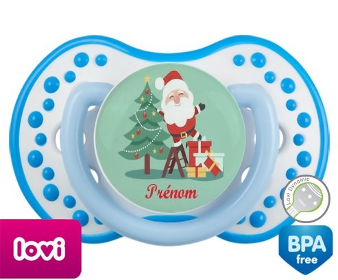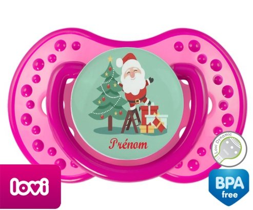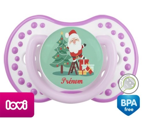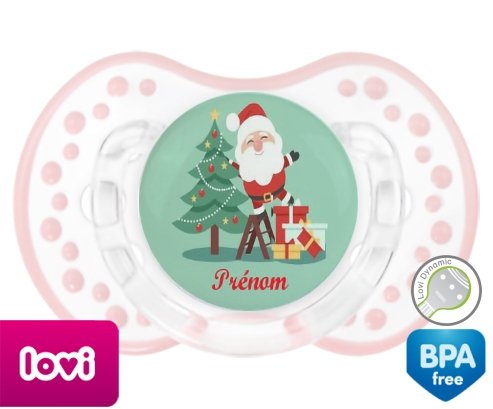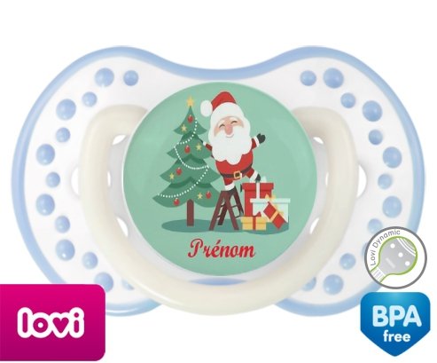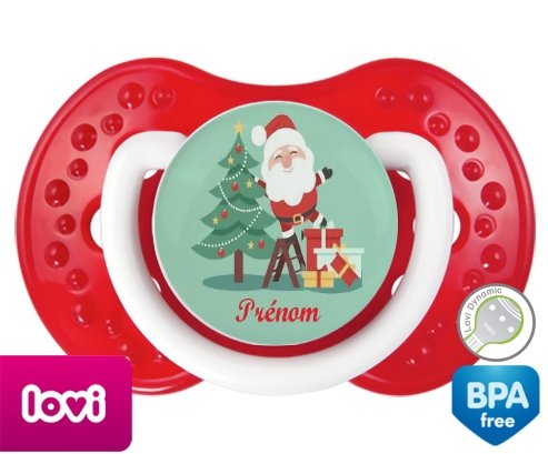 Tétine personnalisée pour bébé Père noël et sapin + prénom à embout LOVI Dynamic en silicone de la marque Lovi Dynamic avec impression en en Couleurs de la collection Prénom personnalisé.La silicone se reconnaît par sa couleur transparente. C'est une matière souple, douce, sans goût ni odeur et offre à bébé une succion plus facile grâce à sa souplesse.
