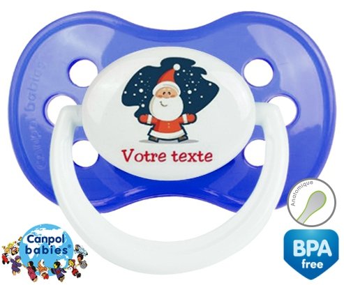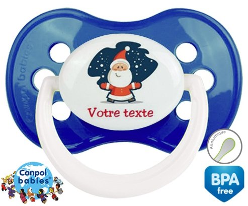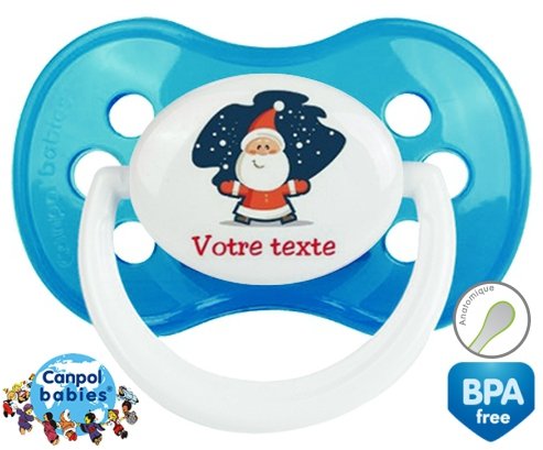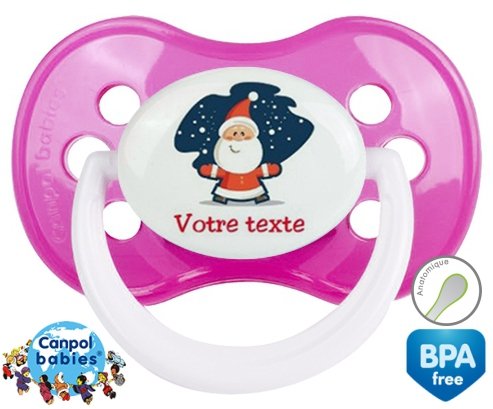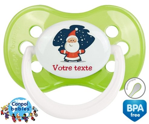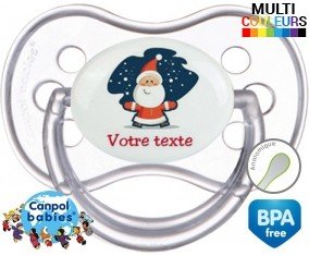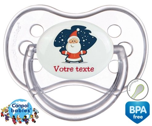 Tetine personnalisee pour bébé Père noël + prénom à embout Anatomique en silicone de la marque Canpol Babies avec impression en en Couleurs de la collection Prénom personnalisé.La silicone se reconnaît par sa couleur transparente. C'est une matière souple, douce, sans goût ni odeur et offre à bébé une succion plus facile grâce à sa souplesse.
