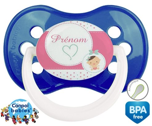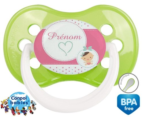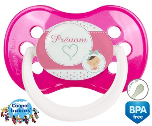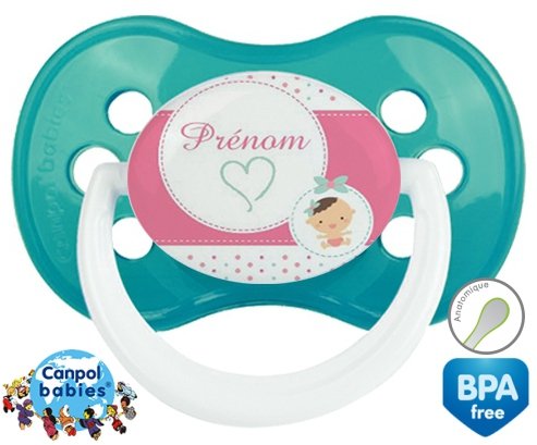 Sucette personnalisée pour bébé Petite (fille) + prénom à embout Anatomique en silicone de la marque Canpol Babies avec impression en en Couleurs de la collection Prénom personnalisé.La silicone se reconnaît par sa couleur transparente. C'est une matière souple, douce, sans goût ni odeur et offre à bébé une succion plus facile grâce à sa souplesse.