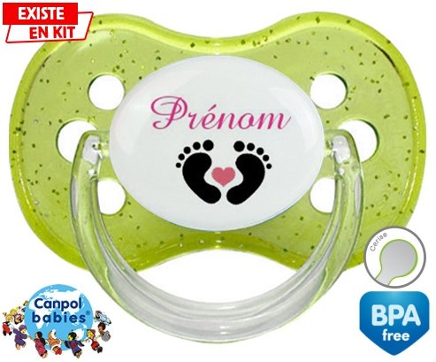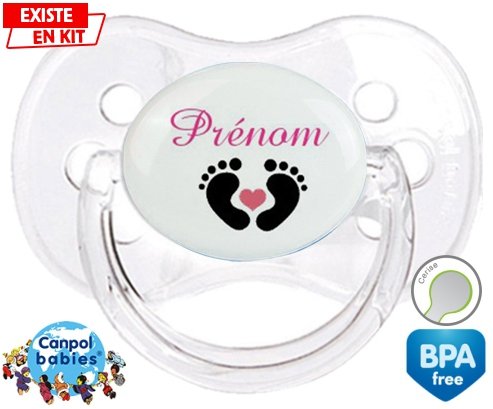Sucette personnalisée pour bébé Pied cœur (fille) + prénom à embout Cerise en silicone de la marque Canpol Babies avec impression en en Couleurs de la collection Prénom personnalisé.La silicone se reconnaît par sa couleur transparente. C'est une matière souple, douce, sans goût ni odeur et offre à bébé une succion plus facile grâce à sa souplesse.