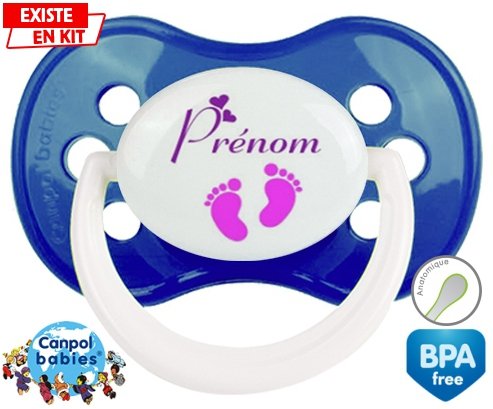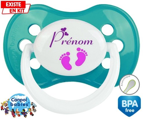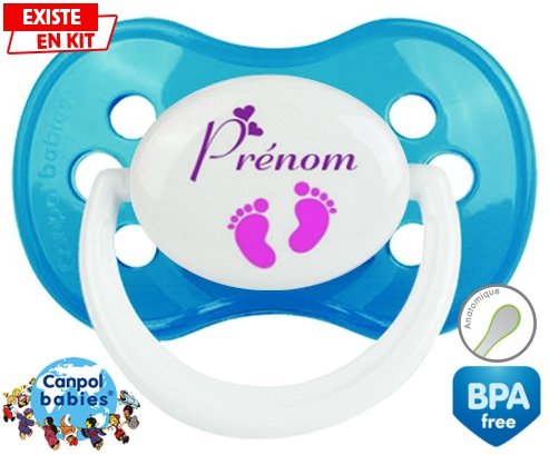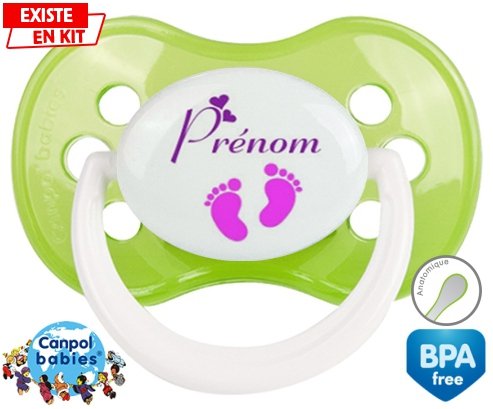Tétine personnalisée pour bébé Pied (fille) + prénom à embout Anatomique en silicone de la marque Canpol Babies avec impression en en Couleurs de la collection Prénom personnalisé.La silicone se reconnaît par sa couleur transparente. C'est une matière souple, douce, sans goût ni odeur et offre à bébé une succion plus facile grâce à sa souplesse.