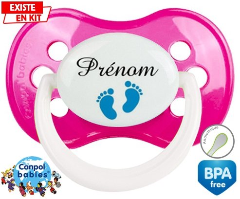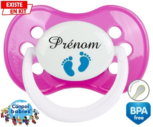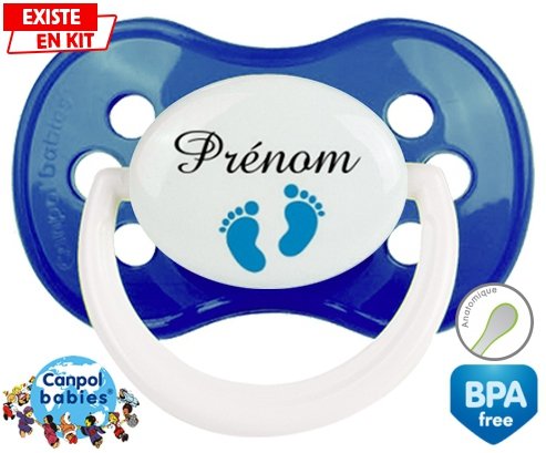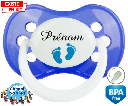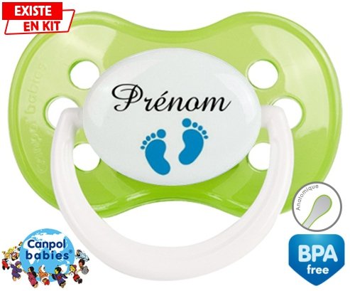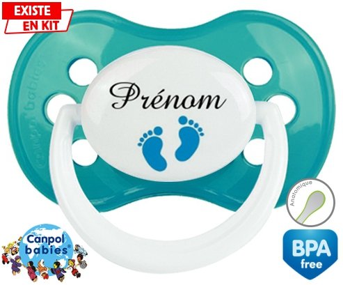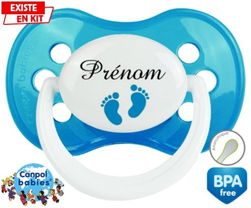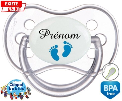 Tetine personnalisee pour bébé Pied (garçon) + prénom à embout Anatomique en silicone de la marque Canpol Babies avec impression en en Couleurs de la collection Prénom personnalisé.La silicone se reconnaît par sa couleur transparente. C'est une matière souple, douce, sans goût ni odeur et offre à bébé une succion plus facile grâce à sa souplesse.