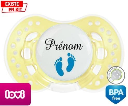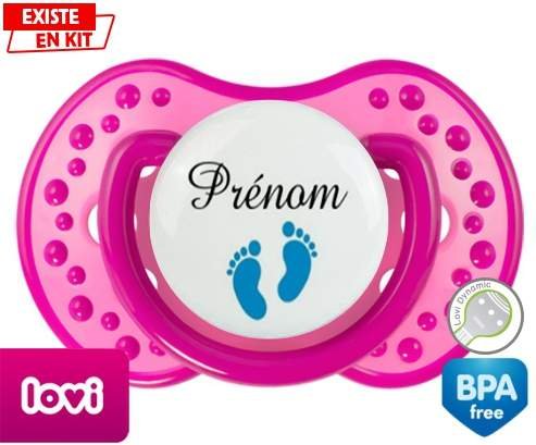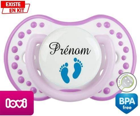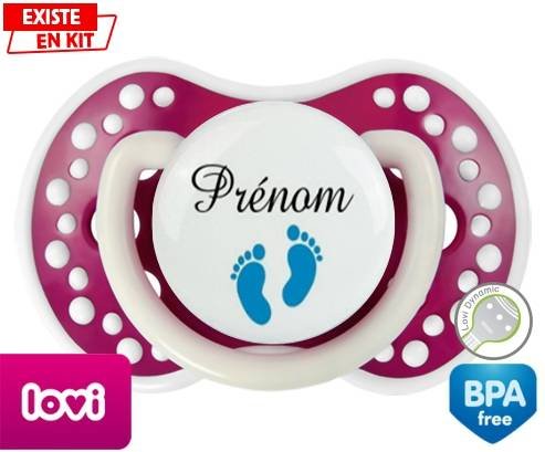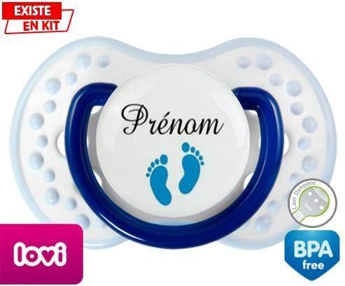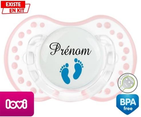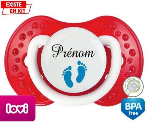 Tétine personnalisée pour bébé Pied (garçon) + prénom à embout LOVI Dynamic en silicone de la marque Lovi Dynamic avec impression en en Couleurs de la collection Prénom personnalisé.La silicone se reconnaît par sa couleur transparente. C'est une matière souple, douce, sans goût ni odeur et offre à bébé une succion plus facile grâce à sa souplesse.