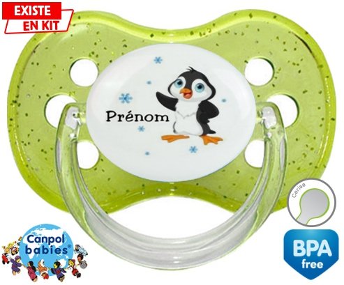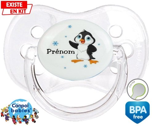 Sucette personnalisée pour bébé Pingouin + prénom à embout Cerise en silicone de la marque Canpol Babies avec impression en en Couleurs de la collection Prénom personnalisé.La silicone se reconnaît par sa couleur transparente. C'est une matière souple, douce, sans goût ni odeur et offre à bébé une succion plus facile grâce à sa souplesse.