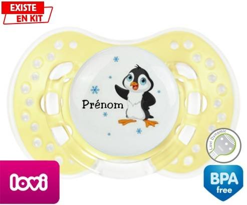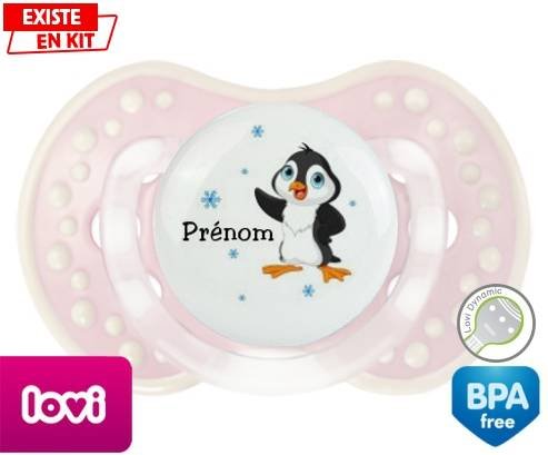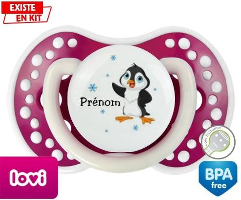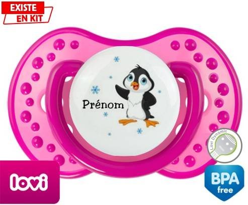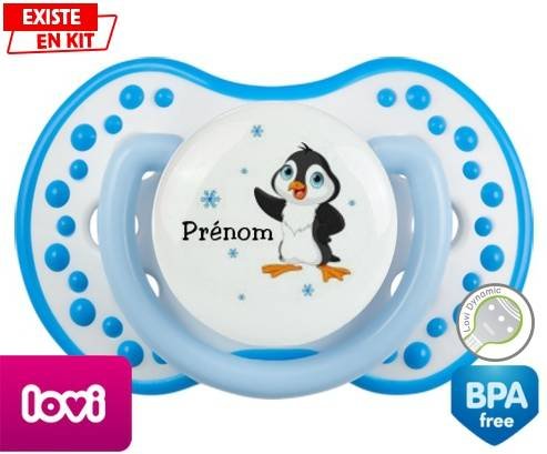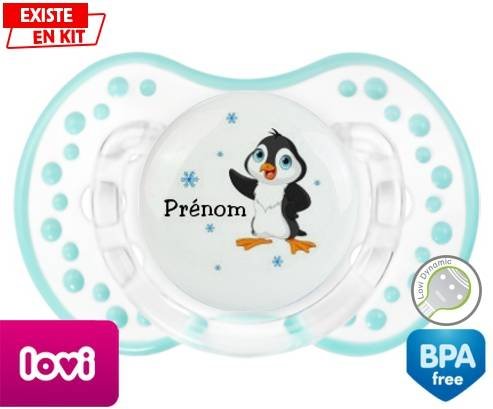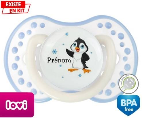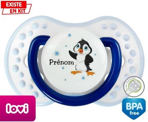 Sucette personnalisée pour bébé Pingouin + prénom à embout LOVI Dynamic en silicone de la marque Lovi Dynamic avec impression en en Couleurs de la collection Prénom personnalisé.La silicone se reconnaît par sa couleur transparente. C'est une matière souple, douce, sans goût ni odeur et offre à bébé une succion plus facile grâce à sa souplesse.