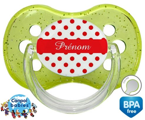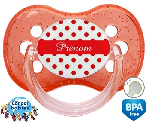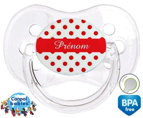 Tétine personnalisée pour bébé Pois rouge + prénom à embout Cerise en silicone de la marque Canpol Babies avec impression en en Couleurs de la collection Prénom personnalisé.La silicone se reconnaît par sa couleur transparente. C'est une matière souple, douce, sans goût ni odeur et offre à bébé une succion plus facile grâce à sa souplesse.