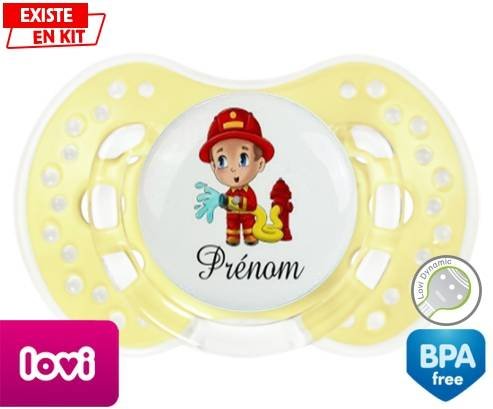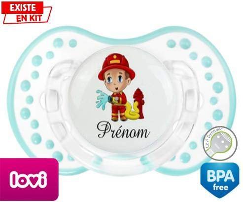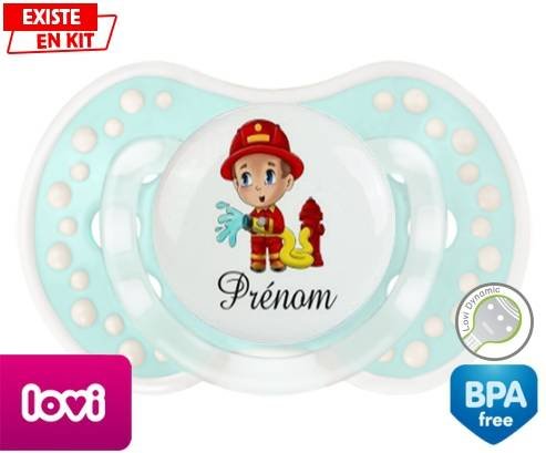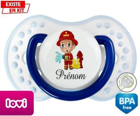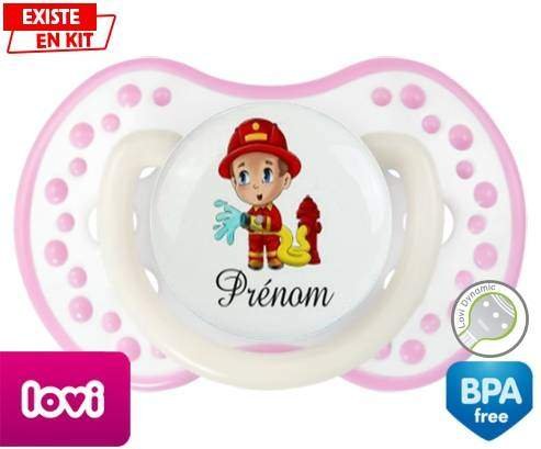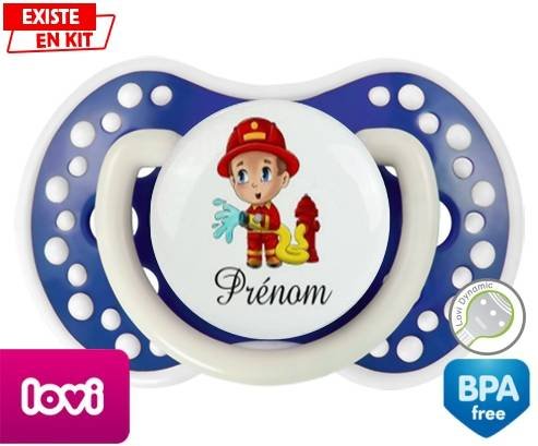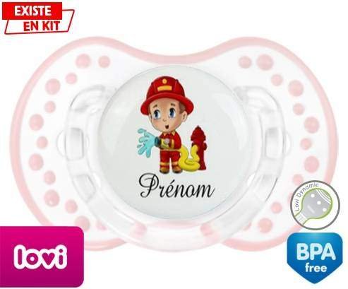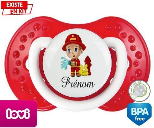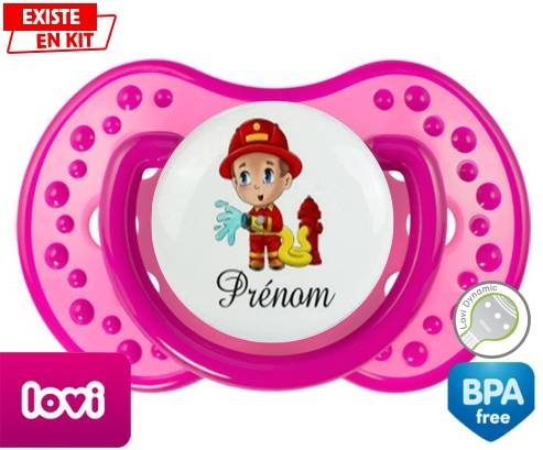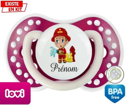 Sucette personnalisée pour bébé Pompier + prénom à embout LOVI Dynamic en silicone de la marque Lovi Dynamic avec impression en en Couleurs de la collection Prénom personnalisé.La silicone se reconnaît par sa couleur transparente. C'est une matière souple, douce, sans goût ni odeur et offre à bébé une succion plus facile grâce à sa souplesse.