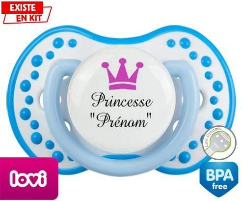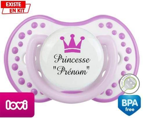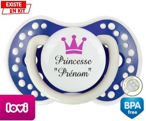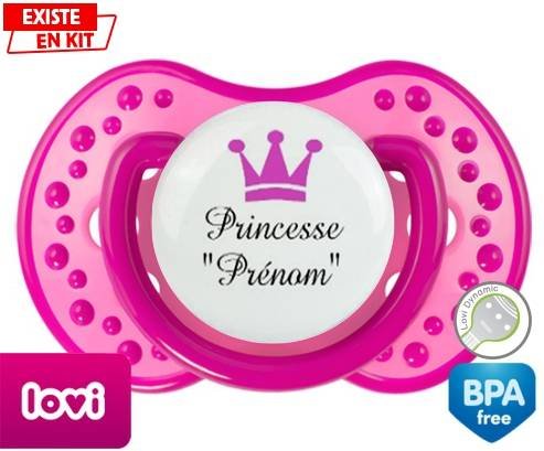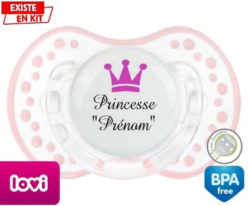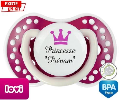 Sucette personnalisée pour bébé Princesse couronne + prénom à embout LOVI Dynamic en silicone de la marque Lovi Dynamic avec impression en en Couleurs de la collection Prénom personnalisé.La silicone se reconnaît par sa couleur transparente. C'est une matière souple, douce, sans goût ni odeur et offre à bébé une succion plus facile grâce à sa souplesse.