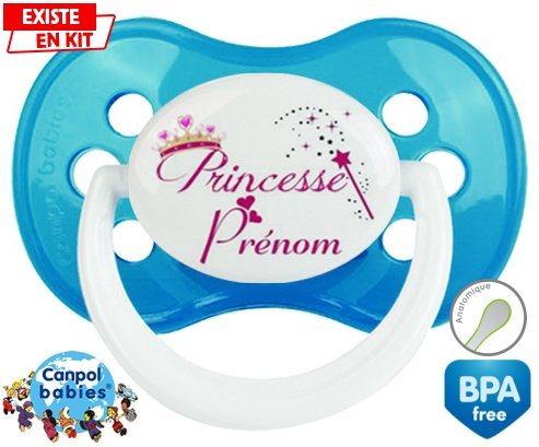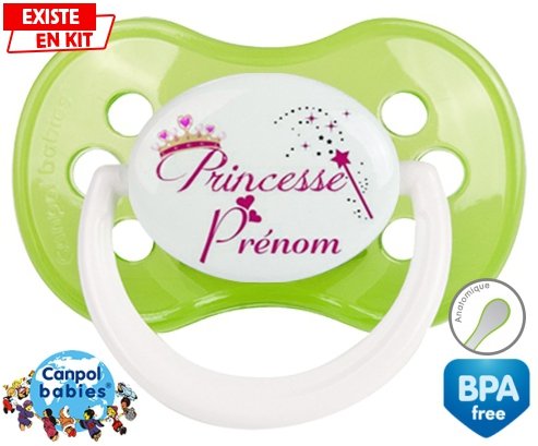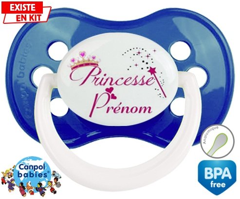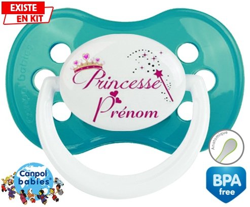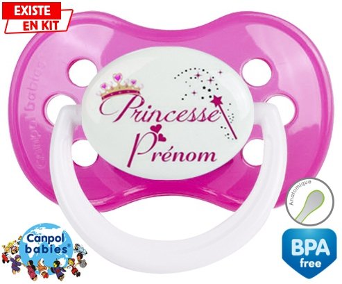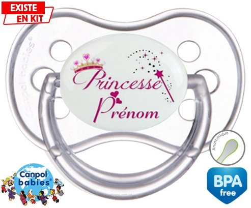 Sucette personnalisée pour bébé Princesse + prénom à embout Anatomique en silicone de la marque Canpol Babies avec impression en en Couleurs de la collection Prénom personnalisé.La silicone se reconnaît par sa couleur transparente. C'est une matière souple, douce, sans goût ni odeur et offre à bébé une succion plus facile grâce à sa souplesse.