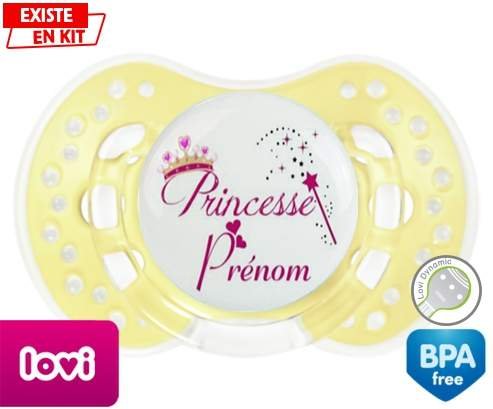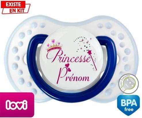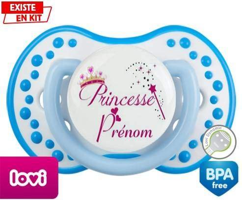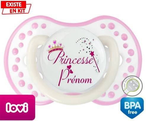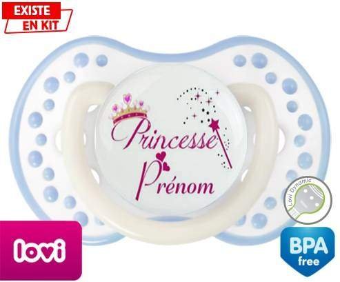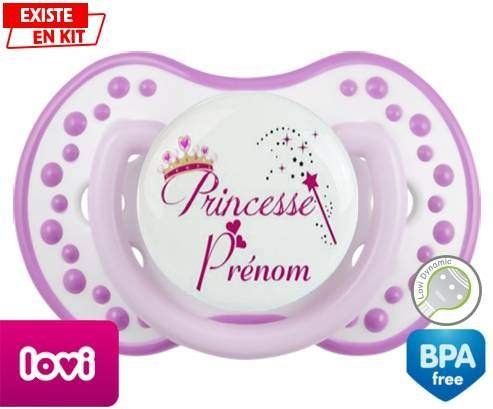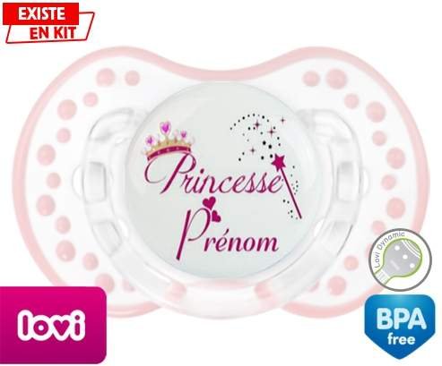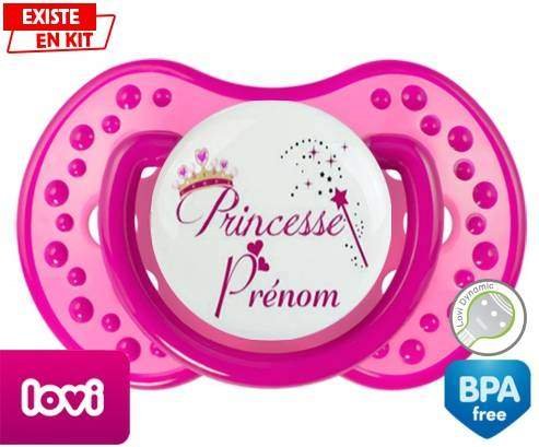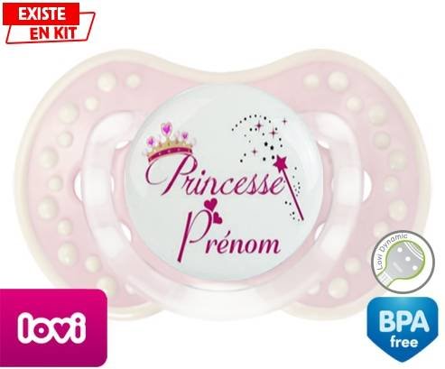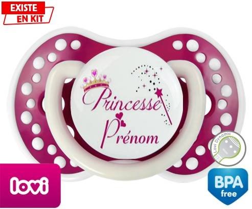 Tétine personnalisée pour bébé Princesse + prénom à embout LOVI Dynamic en silicone de la marque Lovi Dynamic avec impression en en Couleurs de la collection Prénom personnalisé.La silicone se reconnaît par sa couleur transparente. C'est une matière souple, douce, sans goût ni odeur et offre à bébé une succion plus facile grâce à sa souplesse.