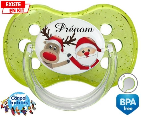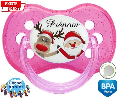 Sucette personnalisée pour bébé Renne et père noël + prénom à embout Cerise en silicone de la marque Canpol Babies avec impression en en Couleurs de la collection Prénom personnalisé.La silicone se reconnaît par sa couleur transparente. C'est une matière souple, douce, sans goût ni odeur et offre à bébé une succion plus facile grâce à sa souplesse.
