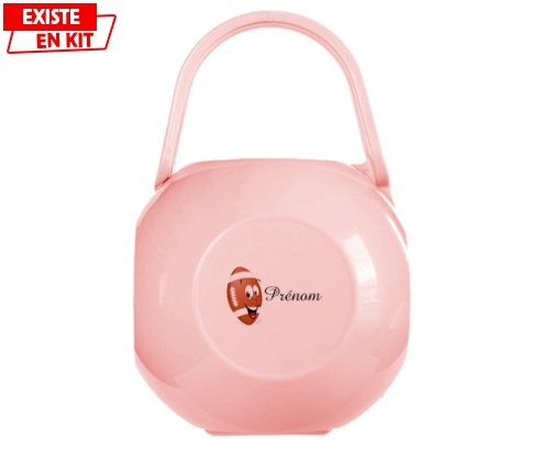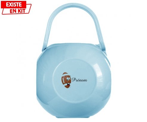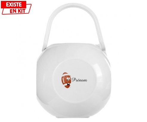 Boîte à sucette personnalisée : Rugby ballon + prénom , avec une impression en couleur et qui compléte toute la gamme ( sucette, attache-sucette, bavoir, chausson, body et bonnet).