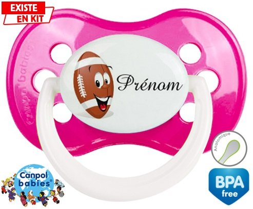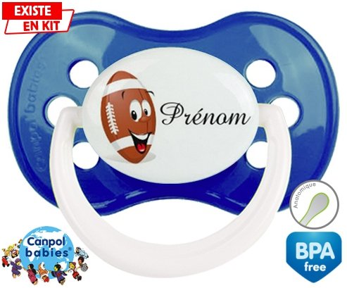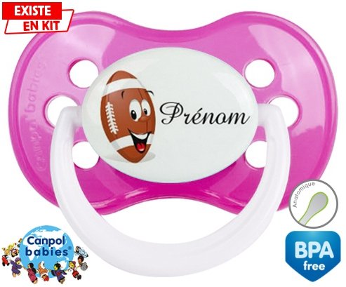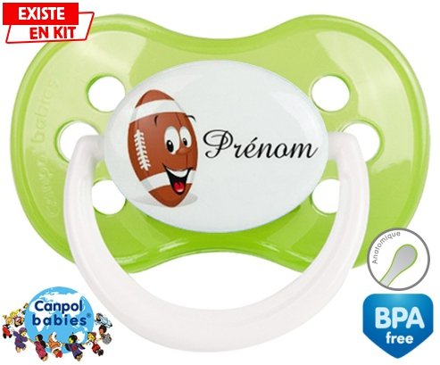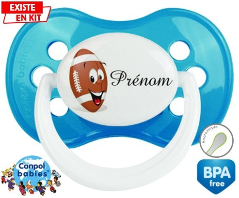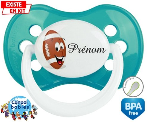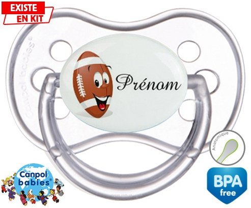 Sucette personnalisée pour bébé Rugby ballon + prénom à embout Anatomique en silicone de la marque Canpol Babies avec impression en en Couleurs de la collection Prénom personnalisé.La silicone se reconnaît par sa couleur transparente. C'est une matière souple, douce, sans goût ni odeur et offre à bébé une succion plus facile grâce à sa souplesse.