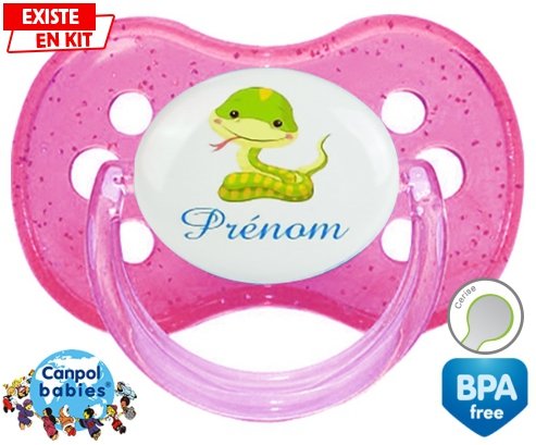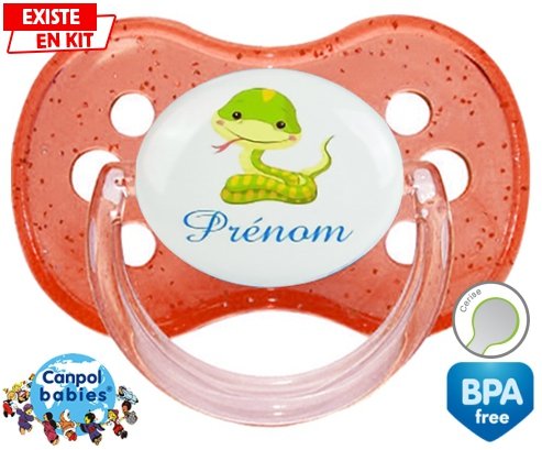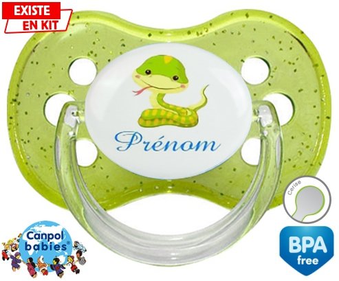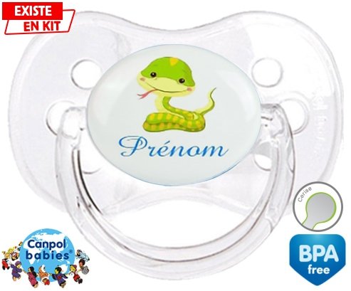 Sucette personnalisée pour bébé Serpent + prénom à embout Cerise en silicone de la marque Canpol Babies avec impression en en Couleurs de la collection Prénom personnalisé.La silicone se reconnaît par sa couleur transparente. C'est une matière souple, douce, sans goût ni odeur et offre à bébé une succion plus facile grâce à sa souplesse.