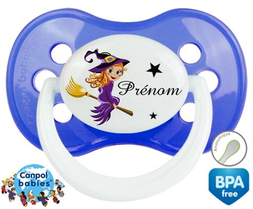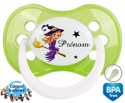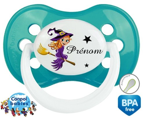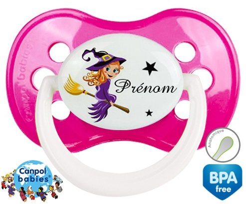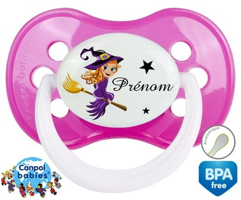Tetine personnalisee avec le prénom pour bébé Sorcière + prénom : Embout Anatomique en silicone de la marque Canpol Babies avec impression en couleur.