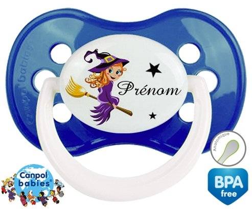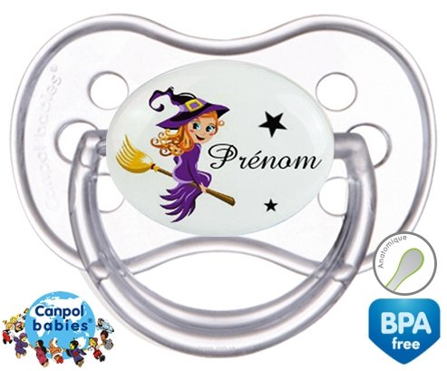 Tetine personnalisee pour bébé Sorcière + prénom à embout Anatomique en silicone de la marque Canpol Babies avec impression en en Couleurs de la collection Prénom personnalisé.La silicone se reconnaît par sa couleur transparente. C'est une matière souple, douce, sans goût ni odeur et offre à bébé une succion plus facile grâce à sa souplesse.