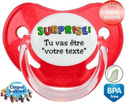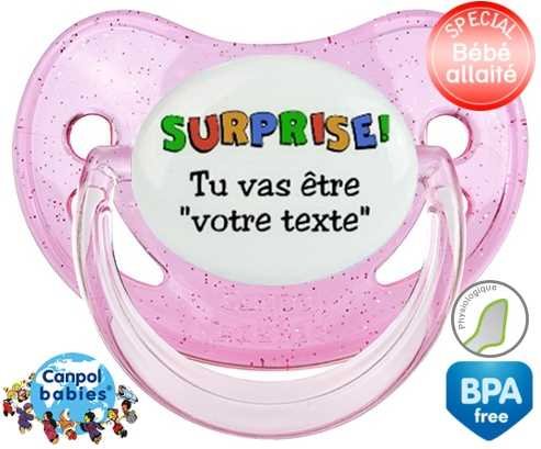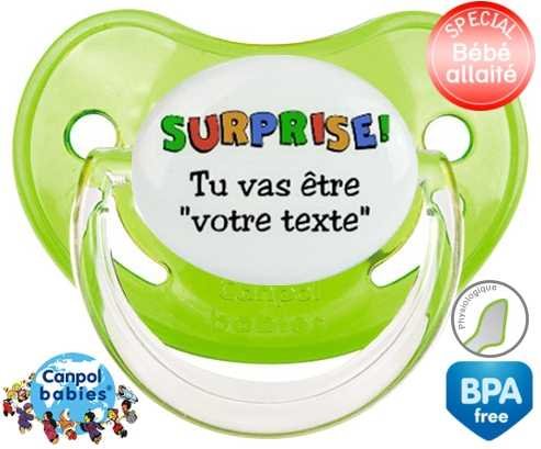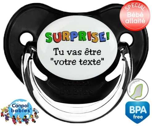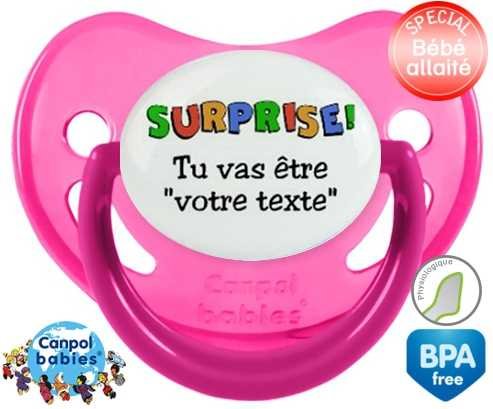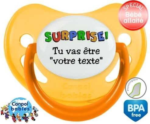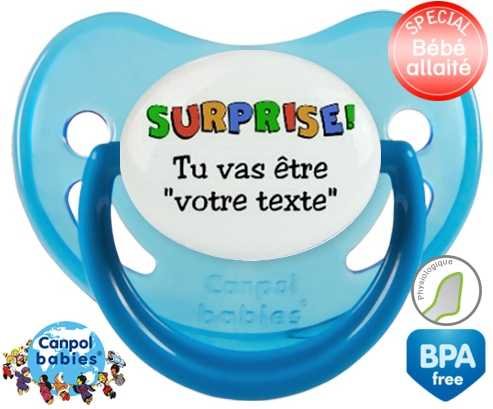 Sucette personnalisée pour bébé Surprise tu vas être... + prénom à embout Physiologique en silicone de la marque Canpol Babies avec impression en en Couleurs de la collection Prénom personnalisé.La silicone se reconnaît par sa couleur transparente. C'est une matière souple, douce, sans goût ni odeur et offre à bébé une succion plus facile grâce à sa souplesse.